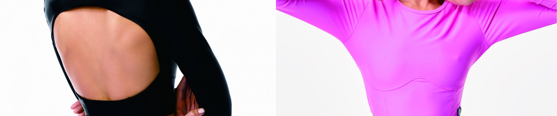 Кроп-топ с длинным рукавом и открытой спиной создаёт элегантный и выразительный контраст. Он подчёркивает линию плеч и спины, визуально вытягивает силуэт и создаёт баланс между закрытостью и женственностью. Плотная ткань обеспечивает лёгкую поддержку груди без необходимости чашек или косточек — это особенно важно для комфорта в движении.