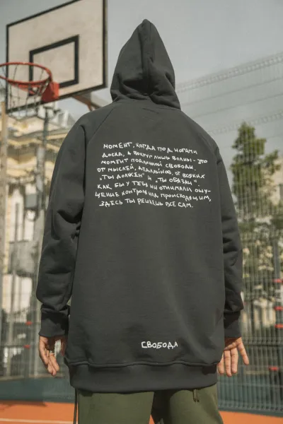 Худи «Свобода» в цвете графит от JOYS BRAND — это не просто одежда, а визуальный манифест. Текст на спине описывает момент, когда ты на волне, и всё исчезает — только доска, вода и внутренняя свобода. Удлинённый фасон, оверсайз-крой, тёплый хлопок и нейтральный графитовый цвет делают эту модель универсальной для серфинга, кемпа, скейта и городской жизни. JOYS BRAND — стиль со смыслом.